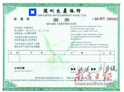 1987年12月,深圳发展银行是内地第一家发行公众股票并公开上市的股份制商业银行。图为深圳发展银行原始股样票。