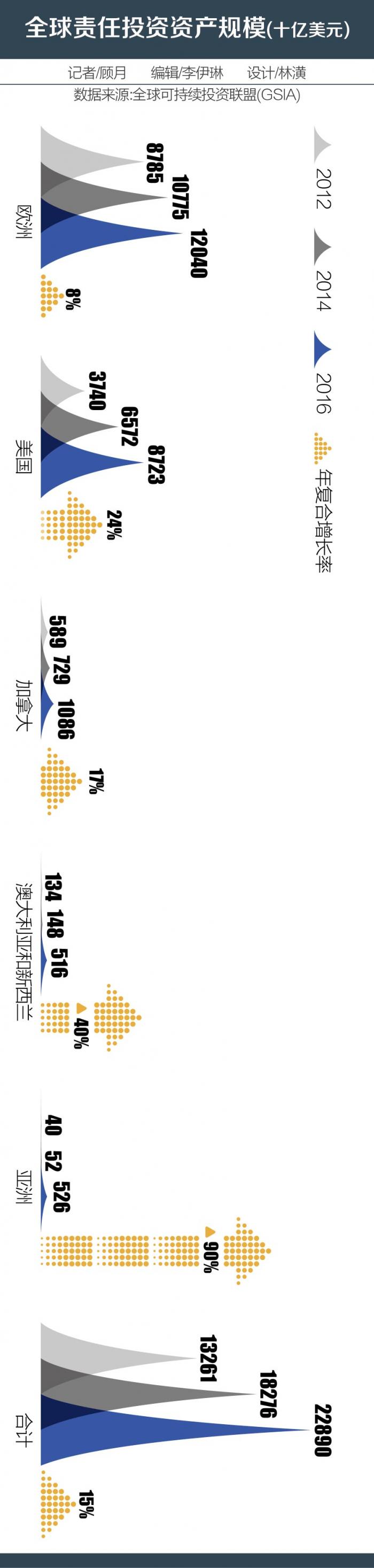 国际可持续投资联盟(GSIA)新近发布的报告显示,在2016年初,全球在投资中纳入ESG因素的资产总量为22.89万亿美元,占全球资产总量的26%,与2012年相比,增长了68.3%。其中欧盟在投资中纳入ESG考量的资产占总资产比例最多,达到52.6%,而亚洲地区(除日本外)则仅有0.8%。
