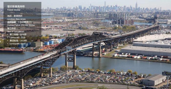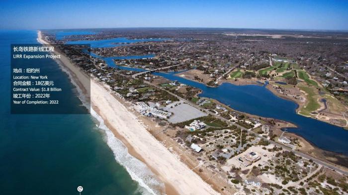 中建于1985年进入美国市场,到目前为止,已经在美国完成100多个项目,合同总额超过上百亿美元。具有代表性的项目是长岛铁路新线工程,合同金额18亿美元,将于2022年竣工。除此之外,他们完成了纽约亚历山大·汉密尔顿大桥项目,合同金额4.07亿美元。该项目于2015年获得中国土木工程学会颁发的史上首个境外詹天佑奖。另外还有新泽西州普拉斯基高架桥项目,合同金额3.35亿美元,于2018年7月全面竣工。