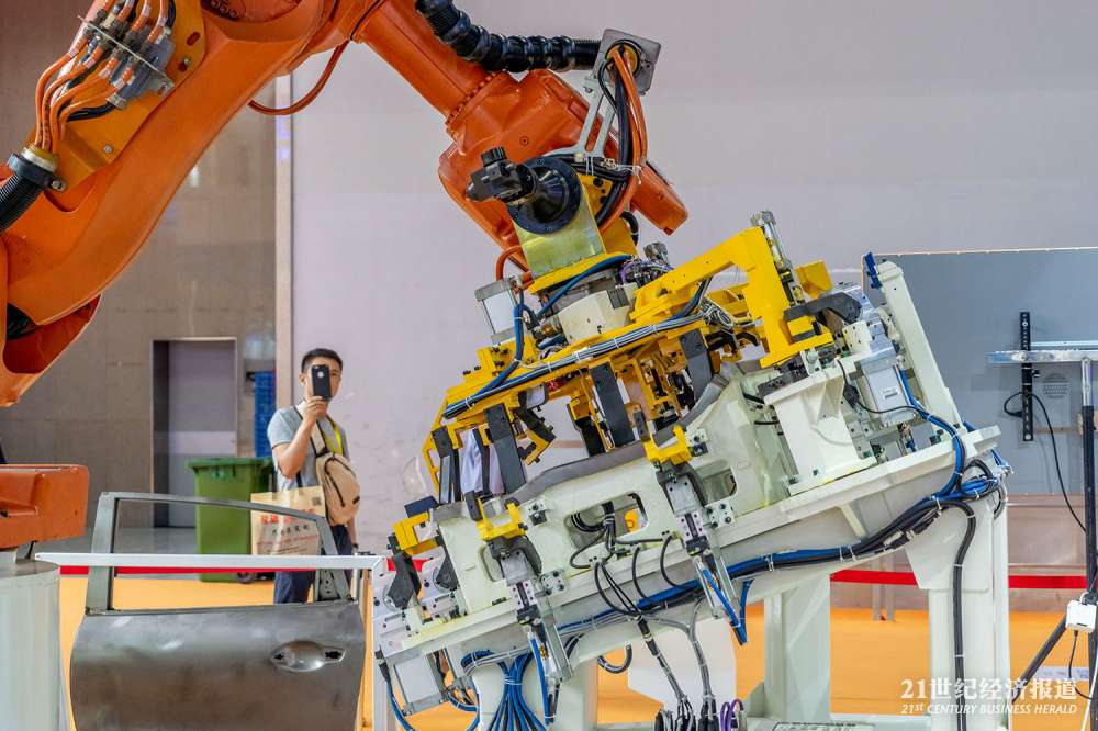 中国汽车工业工程展示的汽车装嵌流水线机器人。