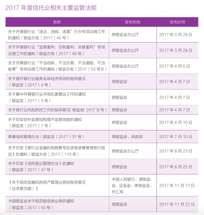 2017年,信托业在“一体三翼”监督管理体系下,监管政策不断完善,行业自律持续强化,保障基金稳健运作,信托登记平稳起步。