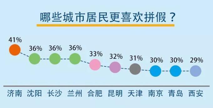 携程数据显示,全国有1/3的上班族在2018中秋国庆拼假出游。最喜欢拼假的城市为济南,高达41%的上班族选择拼假。此外,沈阳、长沙、兰州、合肥、昆明、天津、南京、青岛和西安等城市上班族也喜欢拼假。而北上广深均不在TOP10行列。