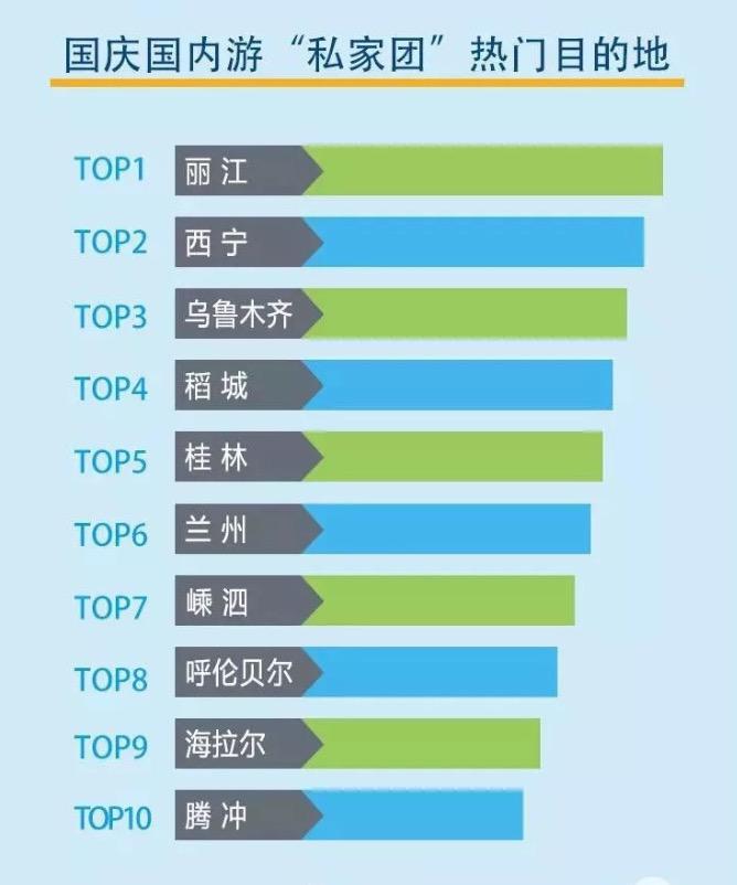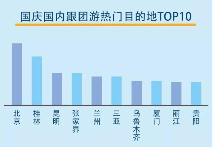 从国内人气最高的目的地城市预测数据来看,前十分别是北京、三亚、桂林、厦门、昆明、张家界、西安、成都、重庆和上海。其中,北京最受跟团游游客欢迎,而自由行最受欢迎的是三亚,私家团则首选丽江。