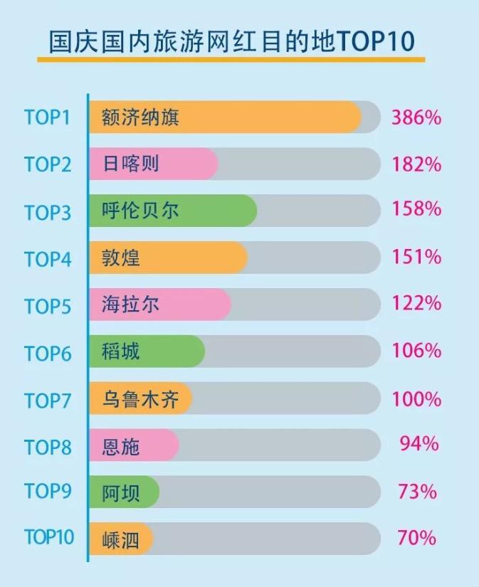 从网红景点来看,由于金秋十月正是欣赏胡杨林的最佳时期,额济纳旗人气暴增386%,成为今年最大的黑马,位居网红目的地排行榜增速第一。