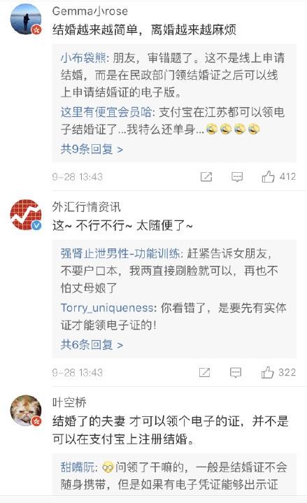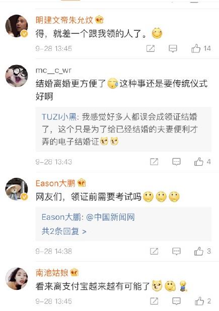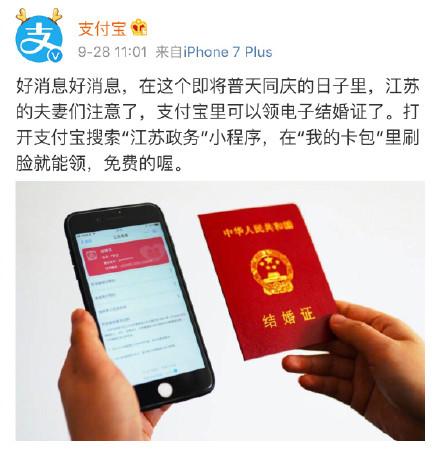 记者从蚂蚁金服方面获悉,江苏的夫妻们可以在支付宝里领电子结婚证了。即,打开支付宝搜索“江苏政务”小程序,在“我的卡包”里刷脸就能免费申领。