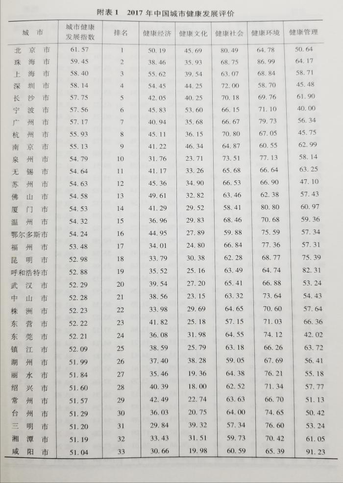 根据2018年9月29日发布的的“中国城市发展高峰论坛暨《城市蓝皮书No.11》, 2017城市健康排名第一是北京,珠海位居第二,上海、深圳、长沙位居第二到第五,广州也排入前十名,另外二线城市南京、宁波、杭州也靠前,三线城市除了珠海外,泉州位居全国第十位。 具体情况是,2017年,北京、珠海、上海、深圳、长沙、宁波、广州、杭州、南京和泉州等十座城市位居城市健康发展指数综合排名前10位。
