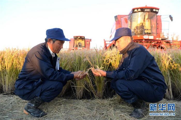 9月26日,黑龙江农垦建三江管理局七星农场职工秦泗利(左)和工友查看水稻长势。新华社记者王凯摄
