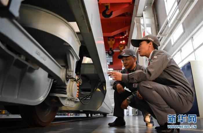 9月26日,黑龙江省齐齐哈尔市中车齐车集团有限公司教授级高工李向伟(左)与企业电焊高级技师张敬华在进行技术研究。新华社记者王建威摄