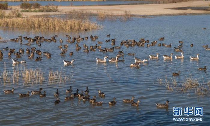 9月27日,在吉林松原查干湖野鸭岛,成群的野生水禽在水中游弋。新华社记者 许畅 摄