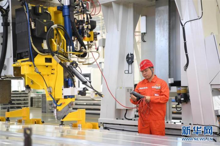 9月27日,辽宁中国忠旺控股有限公司轨道车体制造厂操作人员在工作中。新华社发(龙雷 摄)