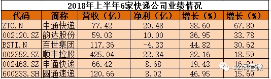 2018年上半年,六家上市快递公司都给出了不错的成绩单,除百世快递亏损外,其余五家快递公司全部盈利,而且六家快递公司净利润全部增长,其中中通快递和韵达股份增长较快,分别增长67.8%和33.78%。
