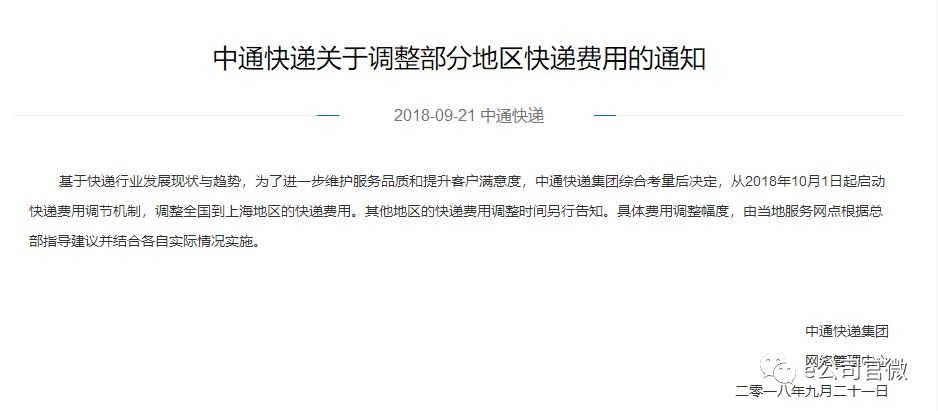 9月21日,中通快递官方对外发布调整部分地区快递费用的通知,称基于快递行业发展现状与趋势,为了进一步维护服务品质和提升客户满意度,中通快递综合考量后决定,从2018年10月1日起启动快递费用调节机制,调整全国到上海地区的快递费用。