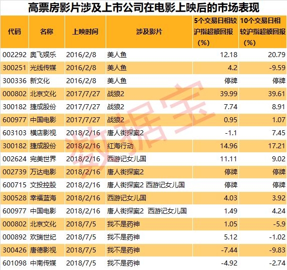 从影片上映后的5或10个市场交易日的市场表现来看,高票房影片涉及上市公司大多受益。数据宝统计,这6部作品涉及的17家上市公司(含重复),除3家为停牌状态外,5个交易日涨跌幅相较于沪指获得超额回报的有11家,占交易样本数量的78.57%,另外10个交易日涨跌幅相较于沪指获得超额回报的有9家,占交易样本数量的比例也超过6成。