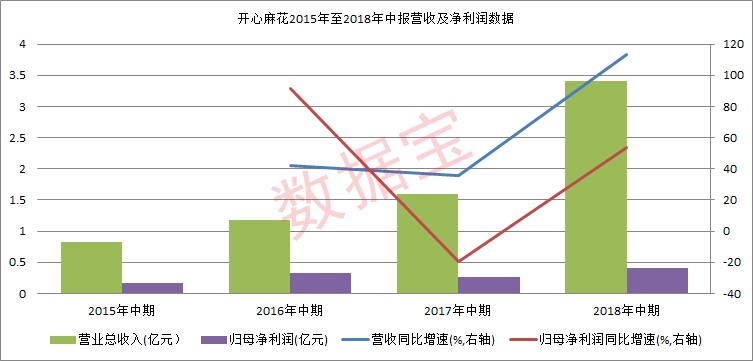 从开心麻花上市以来的业绩来看,自2015年中期至2018年中期,开心麻花的营业总收入连续增长,由0.83亿元攀升至3.41亿元;归母净利润由0.17亿元攀升至0.41亿元。从同比增速来看,开心麻花营收始终保持正增长,尤其是2018年中期,营收交去年实现翻倍;此外,其2018年中期的净利润也同比增长53.72%。