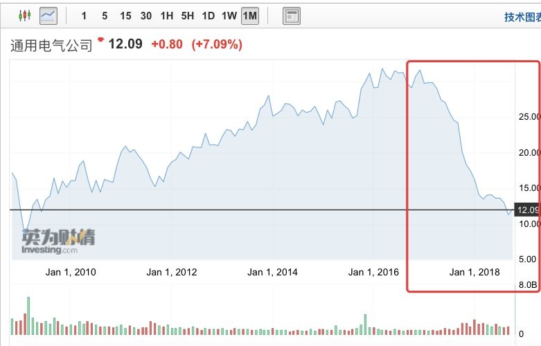 从2016年底的高点到今年9月份,通用电气股价跌幅超过60%,蒸发了约1760亿美元。从约翰·弗兰内里上任时算起,公司市值也蒸发了超过1000亿美元(约合人民币6868亿元)。长期来看,进入21世纪,通用电气的市值已经蒸发了大约5000亿美元,相当于一个脸书公司。