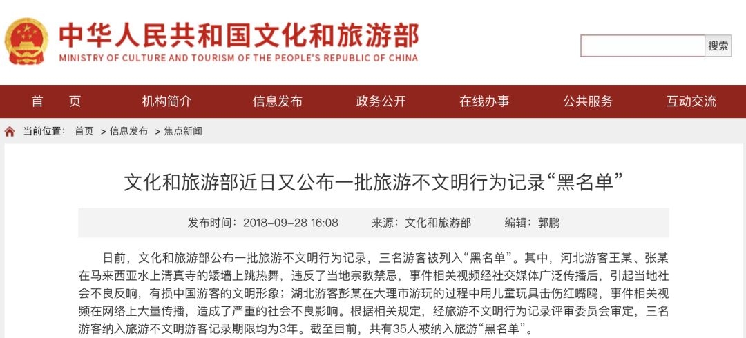 根据中华人民共和国《旅游法》第十三条、《旅游不文明行为记录管理暂行办法》第二条第(三)项、第九条第(二)项之规定,经旅游不文明行为记录评审委员会审定,将王晗、张娜纳入旅游不文明行为记录,记录期限为3年,自2018年9月27日至2021年9月26日。