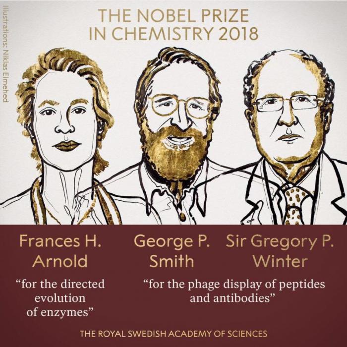 今年的诺贝尔化学奖一半被授予Frances H. Arnold,以表彰她实现了酶的定向演化;另一半被授予George P. Smith和Sir Gregory P. Winter,以表彰他们实现了多肽和抗体的噬菌体展示技术。