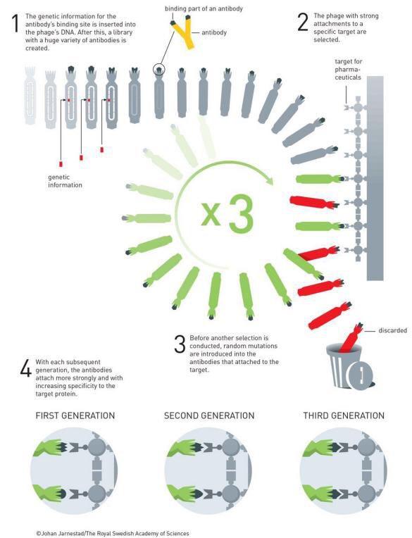 George P. Smith教授则于1985年开创了一种叫作“噬菌体展示”的方法,作为一种感染细菌的病毒,噬菌体可以通过这种方法演化出新的蛋白质。而通过这一方法,他完成了抗体的定向演化,并以此生产出新的药物。以此完成开发的第一个药物阿达木单抗于2002年获批,用于治疗类风湿关节炎、银屑病和炎症性肠病。此后,“噬菌体展示”还产生了可以中和毒素、抵抗自身免疫疾病和治愈转移性癌症的多种抗体。