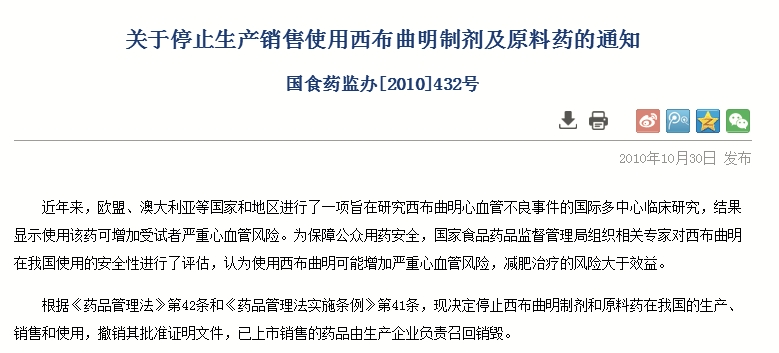 因此,2010年10月30日,国家食药监督管理局发布通知,停止西布曲明制剂和原料药在我国的生产、销售和使用,更不允许在食品中添加。