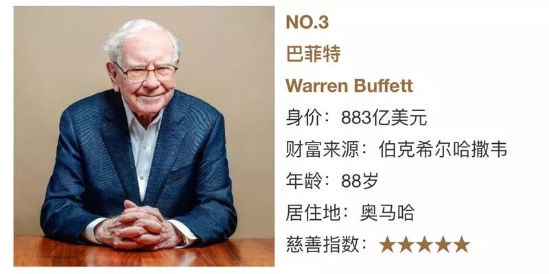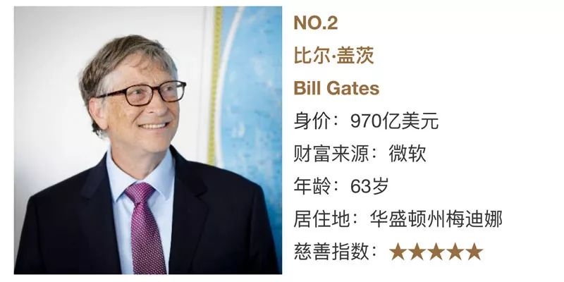在本次发布的排行中,比尔·盖茨以970亿美元的身价位居第二,紧随其后的是身价883亿美元的“股神”沃伦·巴菲特。