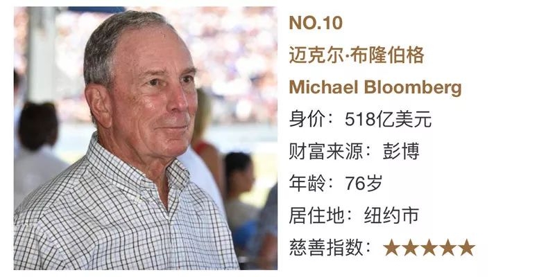 迈克尔·布隆伯格是金融信息与媒体巨头彭博(Bloomber LP)的联合创始人。他已经捐资60亿美元。布隆伯格的基金会正在斥资2亿美元,为美国市长和城市提供支持;他还捐资超过1亿美元,用以减少全球煤炭使用量;除此以外,他还对全球健康和教育事业进行了捐款。