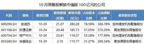 解禁市值超过100亿元的公司除了上述三家外,还有合盛硅业(603260.SH),共四家公司。且这四家公司解禁时间都发生在10月下旬。