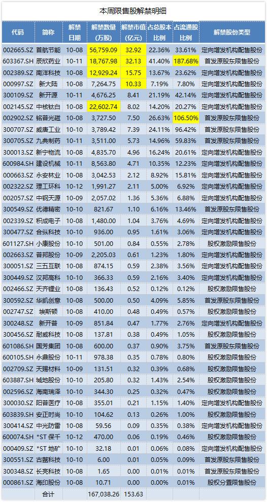 本周解禁股份超过1亿股的上市公司有4家,分别是首航节能(002665.SZ)、中核钛白(002145.SZ)、辰欣药业(603367.SH)、南洋科技(002389.SZ)。