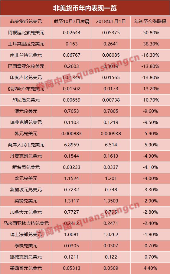 根据券商中国记者的最新统计结果显示,截至北京时间10月7日凌晨(下同),阿根廷比索以兑美元贬值50.8%的幅度“夺冠”,成为年初至今贬值幅度最大的货币。紧随其后的便是土耳其里拉,贬值幅度超30%。