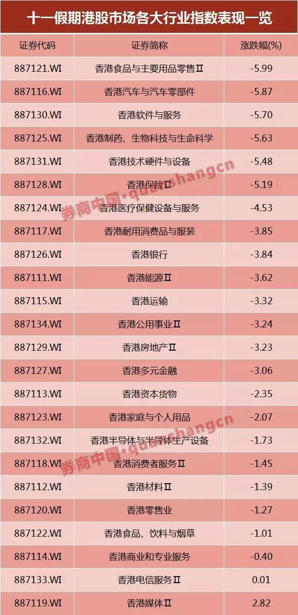 有两个坏消息:一是,十一假期结束了;二是,A股要开盘了… 就在A股开盘前,央行送出了重磅利好:降准1个百分点释放7500亿!虽然央行降准在市场预期之内,但降准力度超乎预期。市场普遍认为,选择此时点宣布降准,将直接利好节后开盘的股市,避免A股跟随海外股市震荡补跌调整。 据券商中国记者统计,国庆假期全球各大重要股市均出现下跌。 银保监会节前下发的《商业银行理财业务监督管理办法》,也为A股带来些许暖意,公募理财可通过公募基金投资股票。此外,国庆长假外围商品期货市场却迎来一轮普涨格局,这对于A股能源、有色、农产品等板块形成一定利好。 不过,除了上述利好外,A股面临的利空可不少: 一,与A股最为紧密的港股市场假期连跌4日,市值蒸发1.53万亿; 二,科技股领衔美股两日重挫,纳指创3月以来最差单周表现; 三,美债收益率创七年新高,资金从新兴市场出逃 四,强势美元周期下,更多新兴市场遭遇股汇双杀; 五,影视行业遭遇寒流,影视股承压。 值得注意的是,节前A股迎来一波反弹行情,沪指8个交易日内大涨6.39%。除了上述消息面的变化外,A股内部也正发生着深层次变化: 变化一:外资正以前所未有的速度流入我国证券市场,二季度证券投资净流入610亿美元,创季度历史新高; 变化二:A股入摩又入富,外资定价权增加; 变化三:国资大举接盘上市民企股权,年内多达40多家上市公司股权被国资接手; 变化四:本轮反弹8成个股上涨,普涨行情再来; 变化五:上证50强势归来,食品饮料涨幅称冠。 利空一:港股连跌4日,市值蒸发1.53万亿 10月2日开市以来,恒指连跌四日,暴跌1215.95点,跌幅达4.38%,跌破27000点关口,逼近9月份26219.56点的低点。四天市值蒸发1.53万亿元。 用WIND的二级行业指数来看,食品与主要用品零售、汽车与汽车零部件、软件与服务、医药等板块成下跌主力。 在上证50指数的50只成分股中,同时具备A、H股的公司有国泰君安、中国中车、中国交通建设、中国中铁等27家。国庆假期普遍出现调整,27只H股仅中国中铁上涨1.8%,其余26只均呈现不同程度的下跌,其中南方航空四日累计下跌8.98%居首。 利空二:科技股领衔美股两日重挫 10月4日,美股三大股指集体下挫:标普下跌0.82%,道指跌0.75%,纳指大跌1.81%,创三个月最大单日跌幅。 10月5日,美股三大股指继续下跌:标普下跌0.55%,道指跌0.68%,纳指大跌1.16%。纳指单周累跌3.2%,为3月以来最差。 整体来看,科技股成为美股下跌先锋,FAANG科技明星股组合连跌两日。国庆期间,奈飞跌6.09%,亚马逊跌5.66%,Facebook跌4.34%,英伟达跌3.97%,谷歌母公司Alphabet跌3.25%,微软跌1.96%,特斯拉跌1.07%,苹果跌0.64%。 中概股在国庆期间也出现普跌。拼多多累跌17.15%,新东方跌16.96%,搜狐跌14.08%,微博下跌12.14%,迅雷跌1.71%,唯品会跌11.38%,陌陌跌10.68%,京东跌9.47%,新浪跌7.53%,阿里巴巴跌6.15%,爱奇艺跌5.84%,网易跌5.58%,趣店5.18%,携程跌4.84%。 利空三:美债收益率创七年新高 美东时间10月3日周三,鲍威尔接受PBS采访时表示,美国经济表现“相当正面”(remarkably positive),没有理由不认为当前的经济扩张“可以延续相当一段时间”。这是鲍威尔一周内第二次公开表态,再度表明渐进式加息的立场。 10月5日周五,晚间时段公布的美国9月新增非农就业人数大幅不及预期,10年期美债收益率创下七年新高至3.2309%,30年期美债收益率刷新四年高点至3.396%,美元指数一度跌至95.61%。不过,9月失业率降至近四十九年新低3.7%,当月薪资增速也维持稳定,同比仅小幅下滑至2.8%。 中金公司发布研报称,相比美股市场可能受到的扰动,部分新兴市场在美元融资成本大幅抬升叠加整体全球流动性拐点临近的背景下可能会面临相对更大的压力。外部风险的加大会加速内部问题的暴露、特别是那些自身基本面“脆弱”且抵御外部风险能力较差的市场(如财政与经常账户“双赤字”、外币借款比例较高、以及外汇储备覆盖率不足等)所承受的压力更大。 利空四:强势美元,多国货币遭冲击 美联储加息周期一开启,全球不少国家货币就要被“牵着鼻子走”,货币贬值就成了摆脱不了的魔咒。伴随美联储主席鲍威尔的鹰派讲话,美元再度强势。 与之相对应的是,更多新兴市场遭遇股汇双杀:土耳其里拉、印度卢比和印尼盾再遭血洗。 相比之下,中国内地因为国庆假期休市而免遭波及,但考虑到下周一就要开市,市场尤为关注国内股债汇三大市场后市走势。不过,对汇率来说,从近几日离岸人民币兑美元汇率(CNH)的表现看,预计下周一内地开市后,在岸人民币兑美元汇率(CNY)会继续贬值,但幅度会相对可控,市场普遍预计,短期内破7难度仍大。 利空五:影视行业遭遇寒流,影视股承压 据券商中国记者统计,自6月份以来,有超过100家霍尔果斯的影视公司申请注销,包括了如徐静蕾、冯小刚等多位知名艺人担任法人或持股的企业,政策红利的消失、行业制度的规范管理,让明星资本纷纷撤出这个曾经的避税天堂。 这对于节后A股影视板块来说,无疑是一场利空。东方证券分析师邓文慧表示,影视内容板块受政策监管的影响较大,诸多新的内容形式在政策监管逐步介入后将受到相应掣肘,未来若监管政策进一步收紧,相关产业将受到较大影响。 利好一:央行最强降准,释放7500亿 海外金融市场度过了惊心动魄的一周,就在大家担心明日国内金融市场开盘会大跌之际,中国央行刚刚送来了重磅利好。 10月7日午间,央行发布消息称,