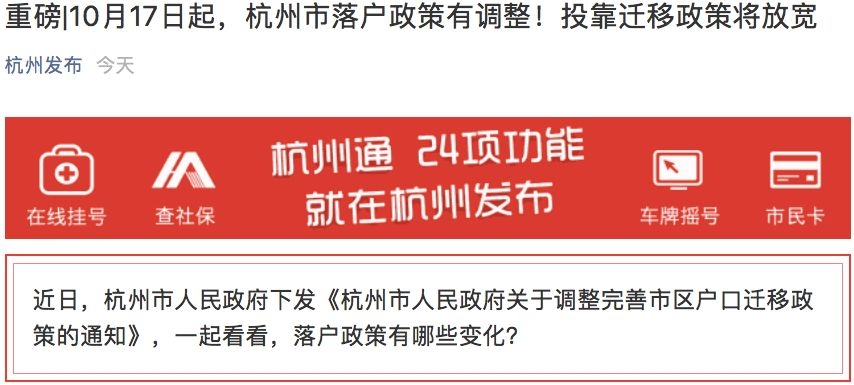 今天(10月8日),“杭州发布”微信号消息称,近日,杭州市人民政府下发《杭州市人民政府关于调整完善市区户口迁移政策的通知》。