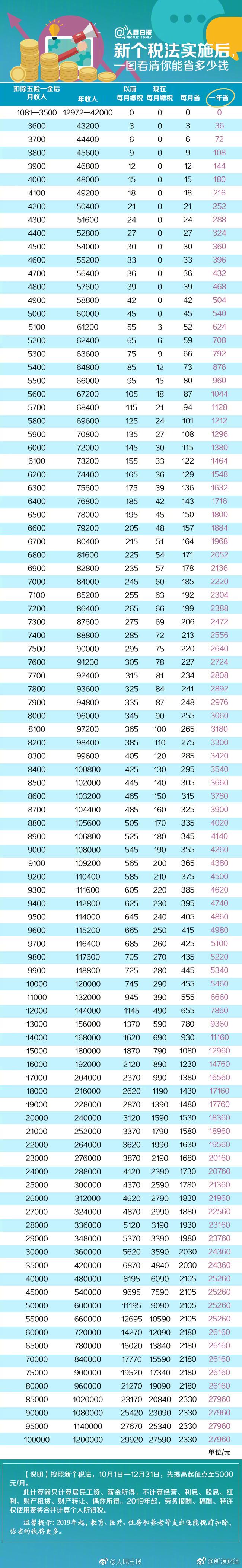 新个税法通过,起征点每月5000元,一图看清你能省多少钱