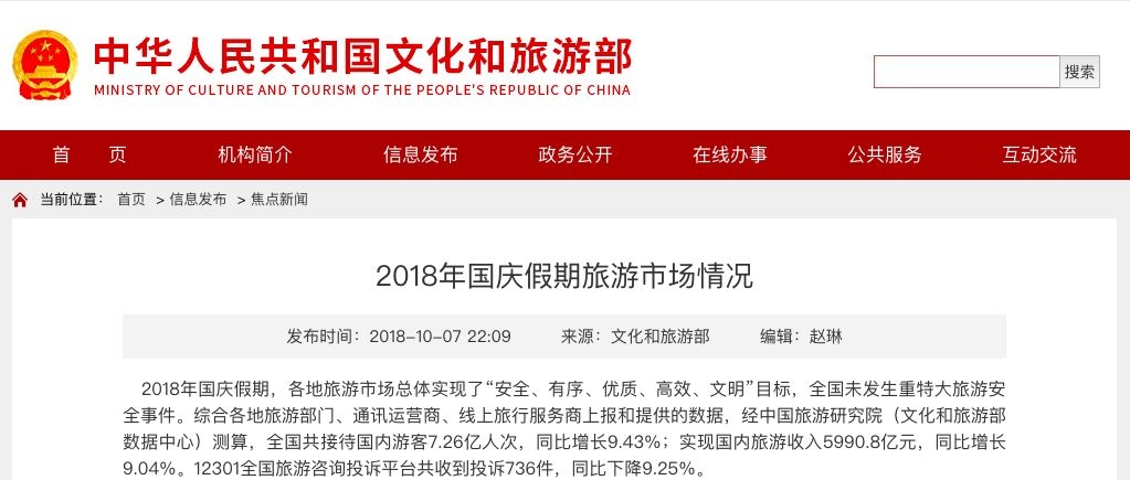 文化和旅游部官网显示,2018年国庆假期,经测算,全国共接待国内游客7.26亿人次,同比增长9.43%;实现国内旅游收入5990.8亿元,同比增长9.04%。