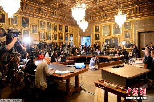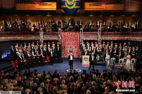 图为2016年诺贝尔经济学奖获得者之一美国经济学家奥利弗•哈特,在颁奖仪式上展示获得奖项。
