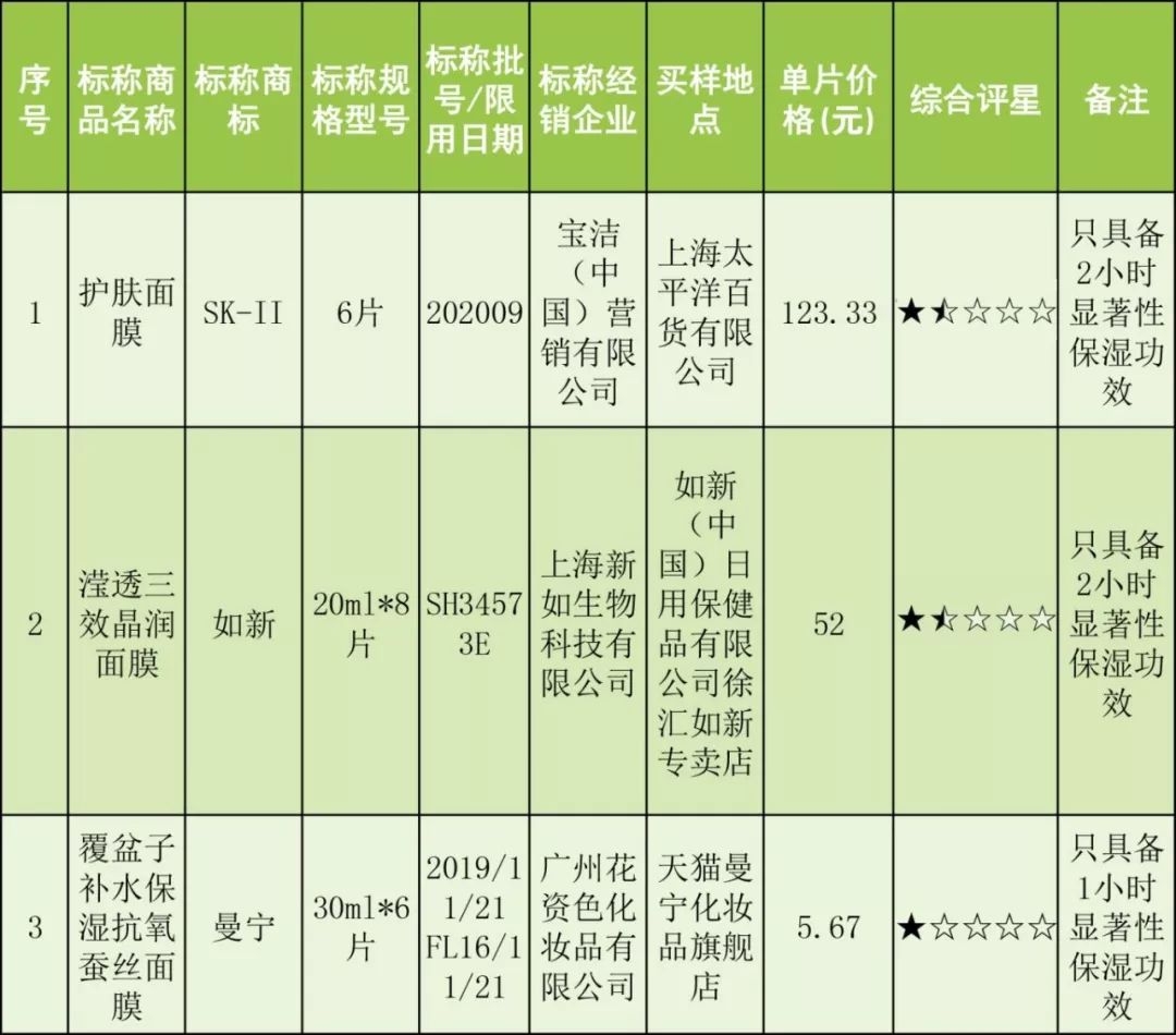 本次比较试验发现,外资品牌的面膜价格普遍高于国产品牌,如外资品牌面贴膜样品的单片价格最高达到123.3元,而国产品牌的单片价格不超过10元,两者相差12倍多。但从保湿效果来看,国产品牌如百雀羚、自然堂、相宜本草等的保湿效果也表现不俗,可以达到4星以上。