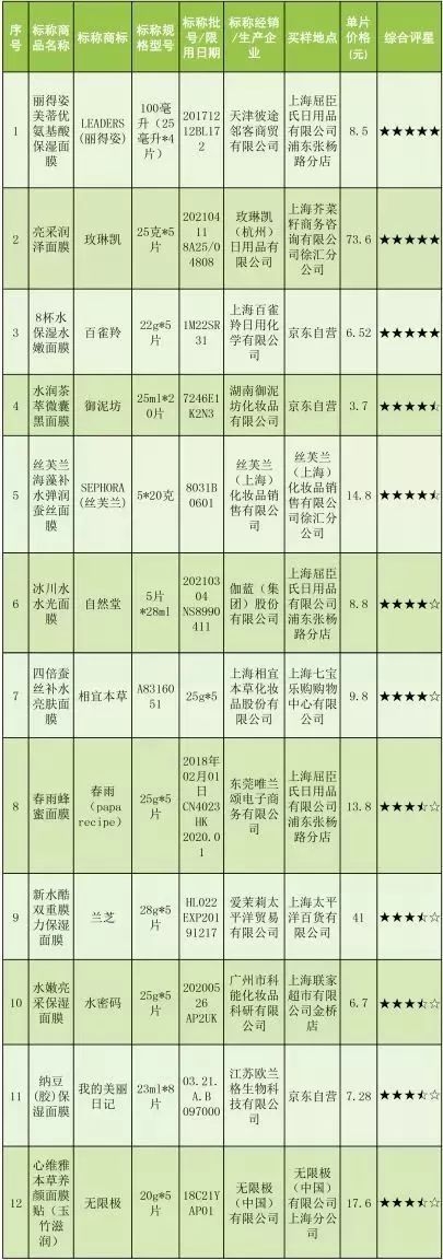 据悉,本次比较试验通过大型商场、品牌专卖店、网络电商平台及直销零售商等渠道购买了40款面膜(其中线下实体店27款,线上电商平台13款),涵盖了自然堂、百雀羚、一叶子等大众品牌,兰蔻、SK-II等高端品牌,以及LEADERS(丽得姿)、utena(佑天兰)、papa recipe(春雨)等日韩网红品牌,面贴膜和涂抹式面膜各20款,面贴膜价格在17.7元至740元之间,涂抹式面膜价格在26.62元至1350元之间。