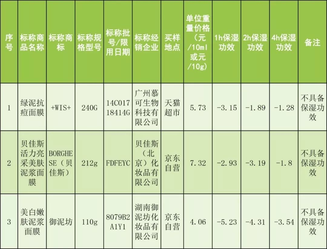 检测结果显示,以1小时保湿功效为例,2款样品的数值达到30以上,保湿效果较好;3款样品在10以下,保湿效果不佳。4小时后,12款样品的保湿功效仍保持在10以上,保湿效果较好(见表一);3款样品的数值仅为0至1.04之间,不具备4小时保湿效果(见表二)。