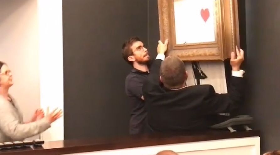 10月6日,班克斯在官方Instagram帐号上传视频,揭示了他的“作案手法”。他多年前悄悄地在这幅画中安装了一台碎纸机,等着在它被拍卖的那一天“大显身手”。