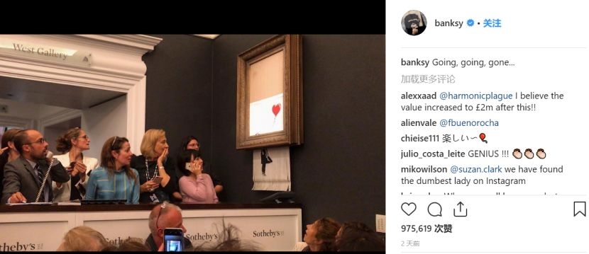 起初,班克斯本人还在社交网站“图享”(Instagram)上拿这件事“挑逗”大家的情绪。他发布了一个短视频,显示了画作被捣毁的时刻,并捕捉到房间里那些人的震惊反应,配图文字是“走远了,走远了,走远了...”