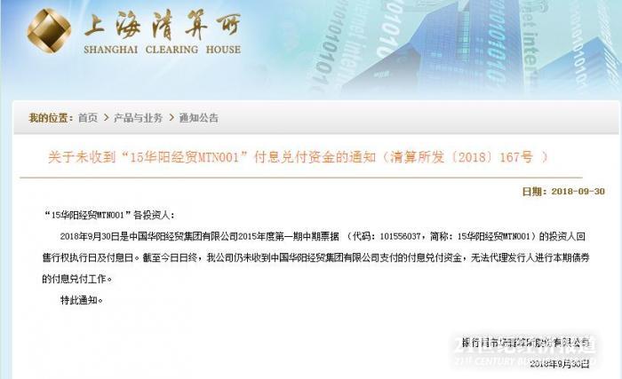 9月30日,节前最后一个工作日,上清所发布公告称, 2018年9月30日是中国华阳经贸集团有限公司2015年度第一期中期票据 (代码:101556037,简称:15华阳经贸MTN001)的投资人回售行权执行日及付息日。截至今日日终,我公司仍未收到中国华阳经贸集团有限公司支付的付息兑付资金,无法代理发行人进行本期债券的付息兑付工作。