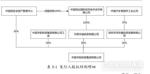 华阳贸易一直自称央企,而公开的发行材料显示,该公司大股东为中国贸促会资产管理中心和中贸华诚投资有限公司两家,分别持股 30.00%。华阳贸易表示,中贸华诚投资由原深圳市华诚大通投资发展有限公司更名,后者的股东为中国四达国际经济技术合作有限公司,也属于中国贸促会间接持股公司。因此中国贸促会资产管理中心持有中国华阳经贸集团有限公司60%股权,履行实际控制人出资人管理职责。