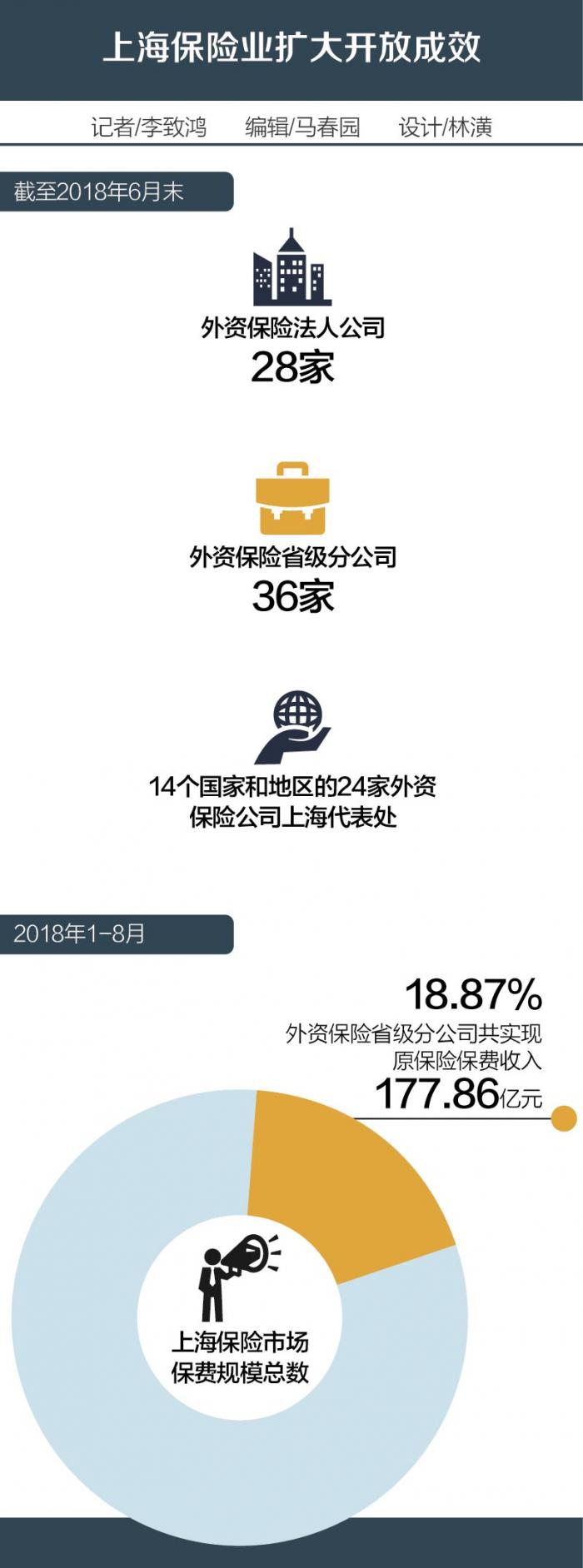 数据显示,截至2018年6月末,上海共有28家外资保险法人公司、36家外资保险省级分公司及来自14个国家和地区的24家外资保险公司上海代表处,外资保险法人公司数量位居全国第一。2018年1-8月,上海外资保险省级分公司共实现原保险保费收入177.86亿元,占上海保险市场保费规模总数的18.87%。