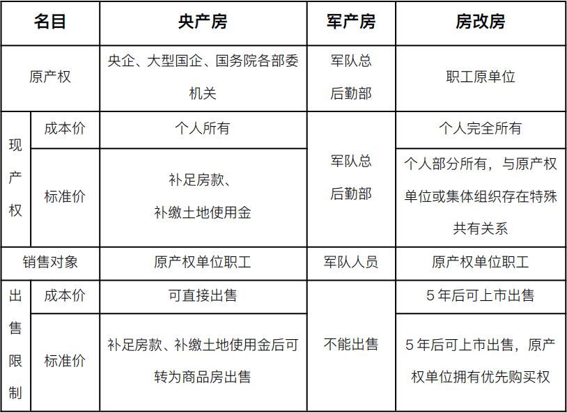 第一类是已购公房。房改之前的存量住房,也就是单位分配的公房参加房改逐渐商品化,职工通过工龄折算,按照成本价或者标准价购买已建公房,根据建设主体可分为央产房、军产房、房改房等,现统称为已购公房。