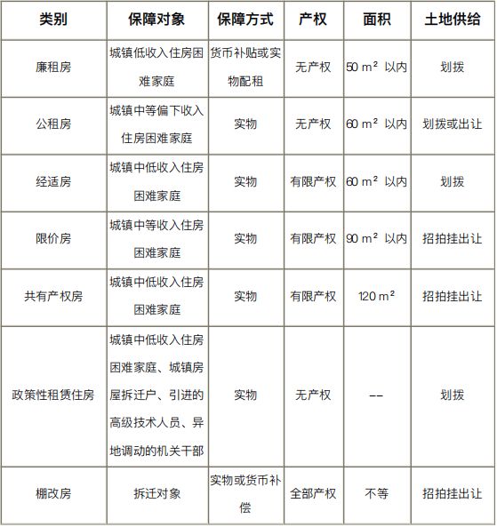 第三类是保障房。保障房是与商品房相对的概念,采用半市场化或非完全市场化运作,以社会公共服务属性为主同时兼顾商品属性,主要是为了满足基本住房需求,而不是交易流通。自1994年国家提出建立具有社会保障性质的住房体系,采取出售和租赁的方式向中低收入家庭提供住房,我国保障性住房种类不断扩充,逐渐丰富。由最初的廉租房、经济适用房两种逐渐扩展为廉租房、公租房、政策性租赁住房、经济适用房、限价房、共有产权房、棚改房等多种类型,在限价格、限对象、限标准共性上有着不同的定位和特点。
