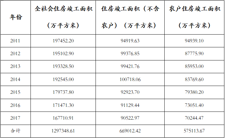 然后,采用固定资产投资项下的住房竣工面积(不含农户)计算2011-2017年城镇住房竣工面积增量。住房竣工面积数据来源为统计局,统计范围为投资500万元及以上的住房竣工面积和全部房地产开发企业的住房竣工面积。2010年之前公布全社会、城镇、农户三个口径的住房竣工面积指标,用全社会扣减城镇、农户可得到小产权面积,由于小产权多集中于城镇地区,因此,全社会住房竣工面积减去农户住房面积即可得到包含小产权房的广义城镇住房竣工面积。2011年后,统计局不再公布狭义的城镇住房竣工面积,直接公布住房竣工面积(不含农户)指标,将2011-2017年住房竣工面积(不含农户)累加后即可得到城镇住房竣工面积增量,最新的2017年统计年鉴中仅有2016年住房竣工面积(不含农户)数据,用2011-2016年的住房竣工面积(不含农户)平均增速估算出2017年的住房竣工面积(不含农户)为9.05亿平方米,累加后得到2011-2017年的城镇住房竣工面积增量为66.90亿平方米。需要说明的是,由于固定资产投资中未包含投资500万元以下的城镇自建房和 “农转城房”,统计口径略微偏小。但考虑到2010年以后这部分占比较低,直接累加近似视为合理。