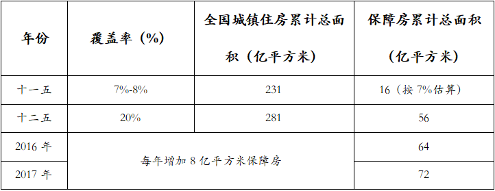 第二,保障房72亿平方米,占比约为24%,作为城镇住房的补充总量已经不低,未来应该保持稳定,否则会挤占过多的市场用地,推高房价,背离保低端、促民生的初衷。保障房是基于十一五和十二五的数据保障房覆盖率数据估算而来,保障房覆盖率即享受保障性住房和通过棚户区改造改善住房条件的家庭户在城镇常住家庭户数占比。2010年我国城镇保障性住房覆盖率为7%-8%,2015年我国城镇保障性住房覆盖率为20%。保障房家庭户均居住面积约为85平方米,假定享受保障房家庭户均居住面积和城镇常住家庭户均居住面积相差不大,可通过2010年的城镇住房总量231亿平方米推算十一五末保障房累计总面积16亿平方米。十二五保障房全面提速,2015年底保障房累计总面积56亿平方米,年均增加8亿平方米,根据十二五期间的保障房进展预测2016年和2017年的保障房增量,相加得到2017年城镇保障房累计面积为72亿平方米。可见,经过十二五加速期后,保障性住房建设正式驶入快车道,总量规模快速增长,覆盖面迅速扩大,未来继续提速的空间有限。