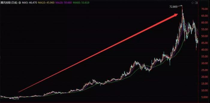 2005年-2007年,腾讯股价由4港元附近涨至72港元附近,涨幅约16倍。