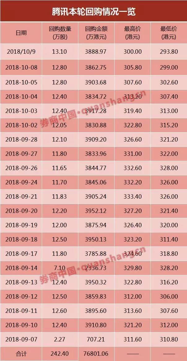 自腾讯9月7日开启“买买买”模式,截至10月9日,腾讯已经连续21个交易日回购股份,长达一个多月时间,这也是腾讯史上最长的不间断回购。