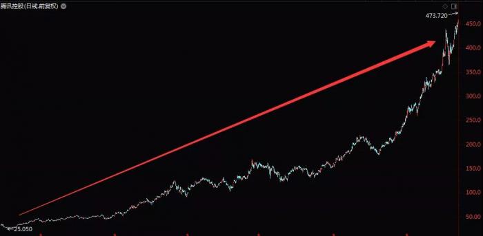 2012年-2017年,腾讯股价由30港元附近涨至475港元附近,涨幅约15倍。腾讯市值更是在此轮大涨过程中,由不足3000亿港元涨至4.5万亿港元,并跻身全球前5大市值公司。