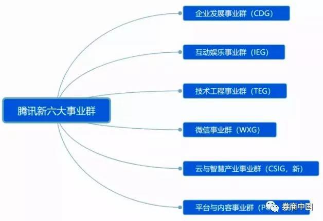 保留原有的企业发展事业群(CDG)、互动娱乐事业群(IEG)、技术工程事业群(TEG)、微信事业群(WXG);又突出聚焦融合效应,新成立云与智慧产业事业群(CSIG)、平台与内容事业群(PCG)。