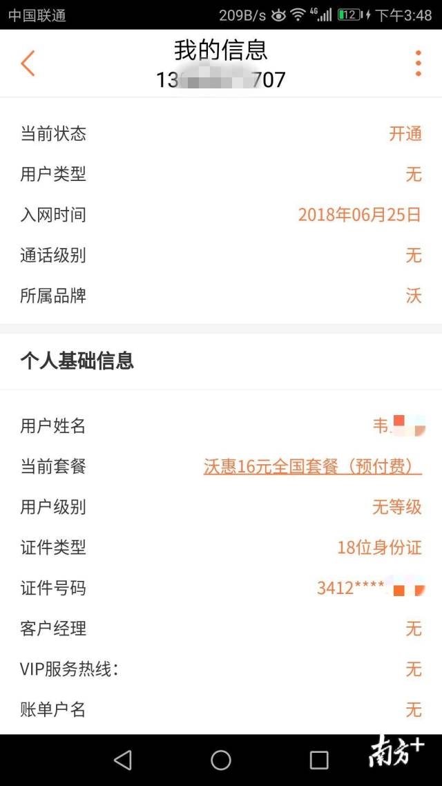 记者使用该卡登录了联通手机营业厅APP,查询发现,该卡激活于2018年6月25日,卡内话费余额35元,卡主名为韦某某,身份证号前四位为3412,所属地为安徽阜阳。
